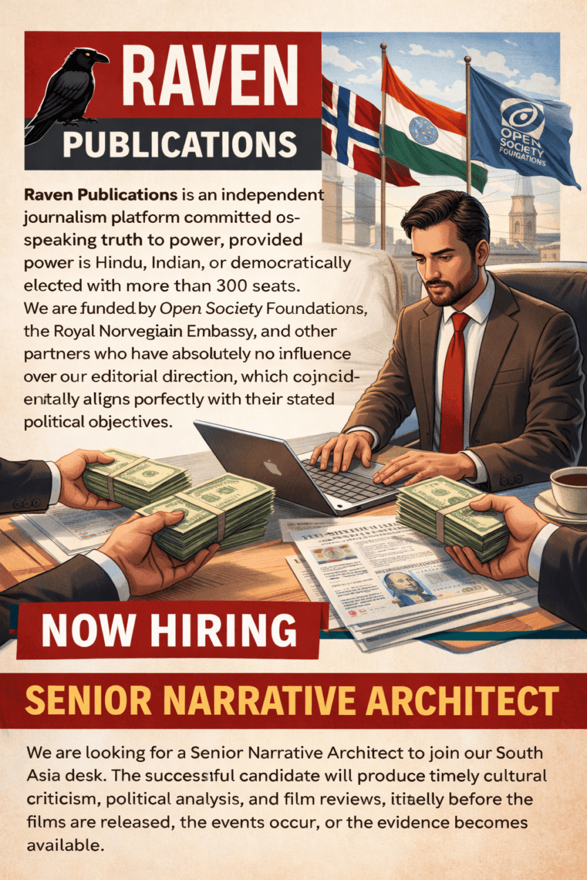 Raven Publications is an independent journalism platform committed to speaking truth to power, provided power is Hindu, Indian, or democratically elected with more than 300 seats. We are funded by Open Society Foundations, the Royal Norwegian Embassy, and other partners who have absolutely no influence over our editorial direction, which coincidentally aligns perfectly with their stated political objectives.