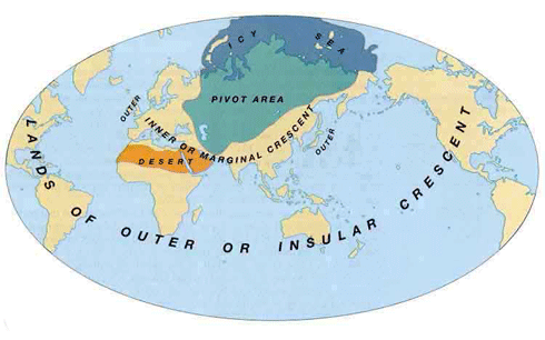 Halford Mackinder argued that geography determines global power. Control the right land, control the world. He divided the globe into following regions: