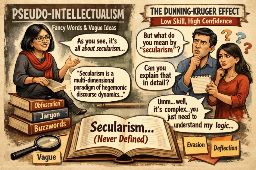 Meera Nanda displays several hallmarks of pseudo-intellectualism as described above. She hides behind fancy words and expect that readers will not turn around and ask her meaning of the fancy word and would simply follow her logic with her presumptive meaning of the fancy word. Secularism is such a loaded word in her thesis, yet she never bothers to define it. Let’s analyze it.
