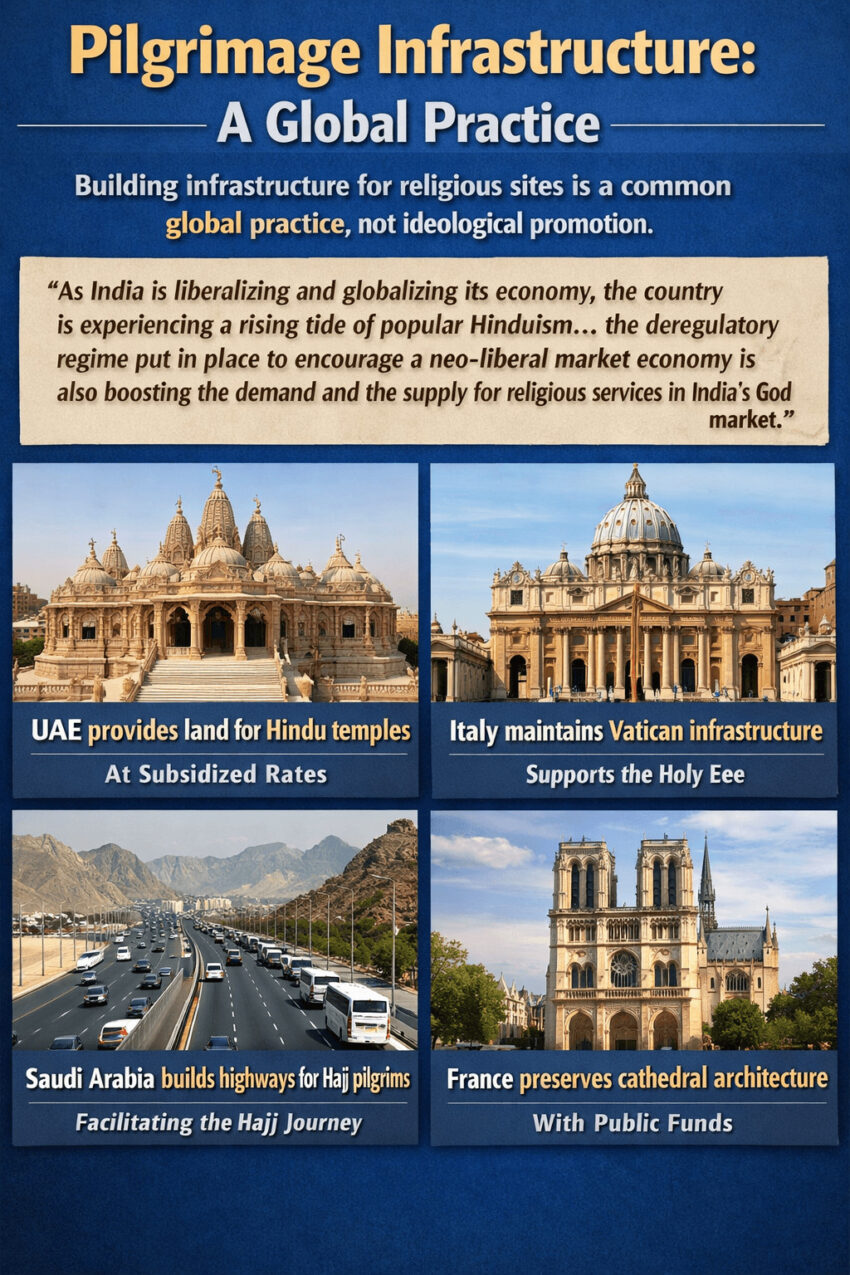 This passage conflates two separate phenomena: (1) citizens choosing to be more religious, and (2) the state promoting religion. Building roads to sites where millions travel is infrastructure management, not ideological promotion. Above all it is a standard Global Practice. These are the examples: