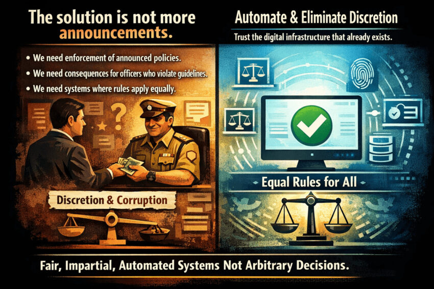 Third, the system rewards discretion. An officer who follows rules strictly is seen as difficult. An officer who exercises “flexibility” is seen as helpful. But flexibility means different rules for different people. It means connections matter more than compliance.