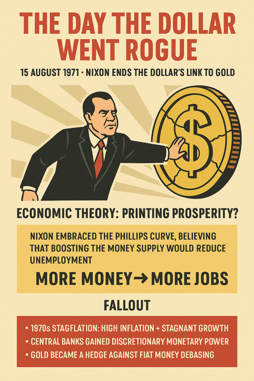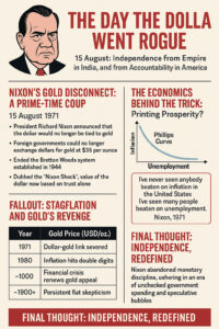Exactly 24 years later, across the world, another kind of liberation occurred—though far less noble. On 15 August 1971, U.S. President Richard Nixon made a quiet announcement that detonated global finance. With a few sentences, he unhooked the dollar from gold, collapsed the Bretton Woods system, and turned the world’s most trusted currency into what economists call fiat money—which is just a polite term for “because we said so.”